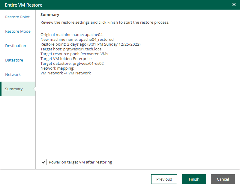 At the Summary step of the wizard, check restore settings and click Finish. If you want to start the restored VM on the target host, select the Power on target VM after restoring check box.