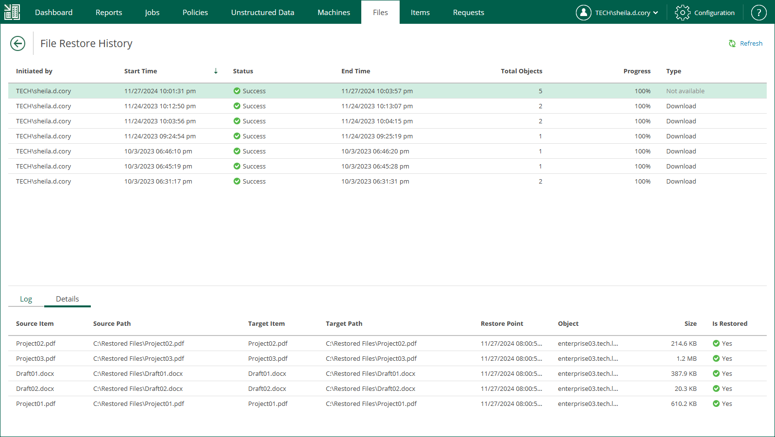 - Check the restore process and results in the File Restore History view.