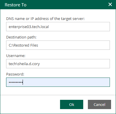 - In the Restore To window, specify restore location and credentials for connection to the target machine: