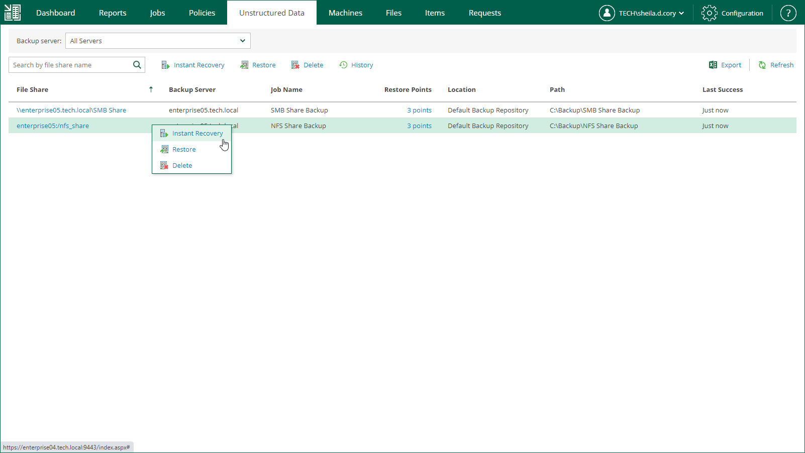 This is an archive version of the document. To get the most up-to-date information, see the current version. Step 1. Launch Instant File Share Recovery Wizard To launch the Instant File Share Recovery wizard, do the following:Open the Unstructured Data tab and select a file share from the list.On the toolbar, click Instant Recovery.Alternatively, you can right-click a file share and select Instant Recovery.