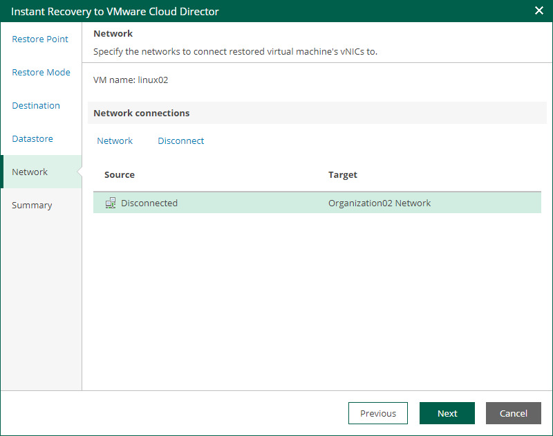 The Network step of the wizard is available if you restore a VM to a new location or with different settings.