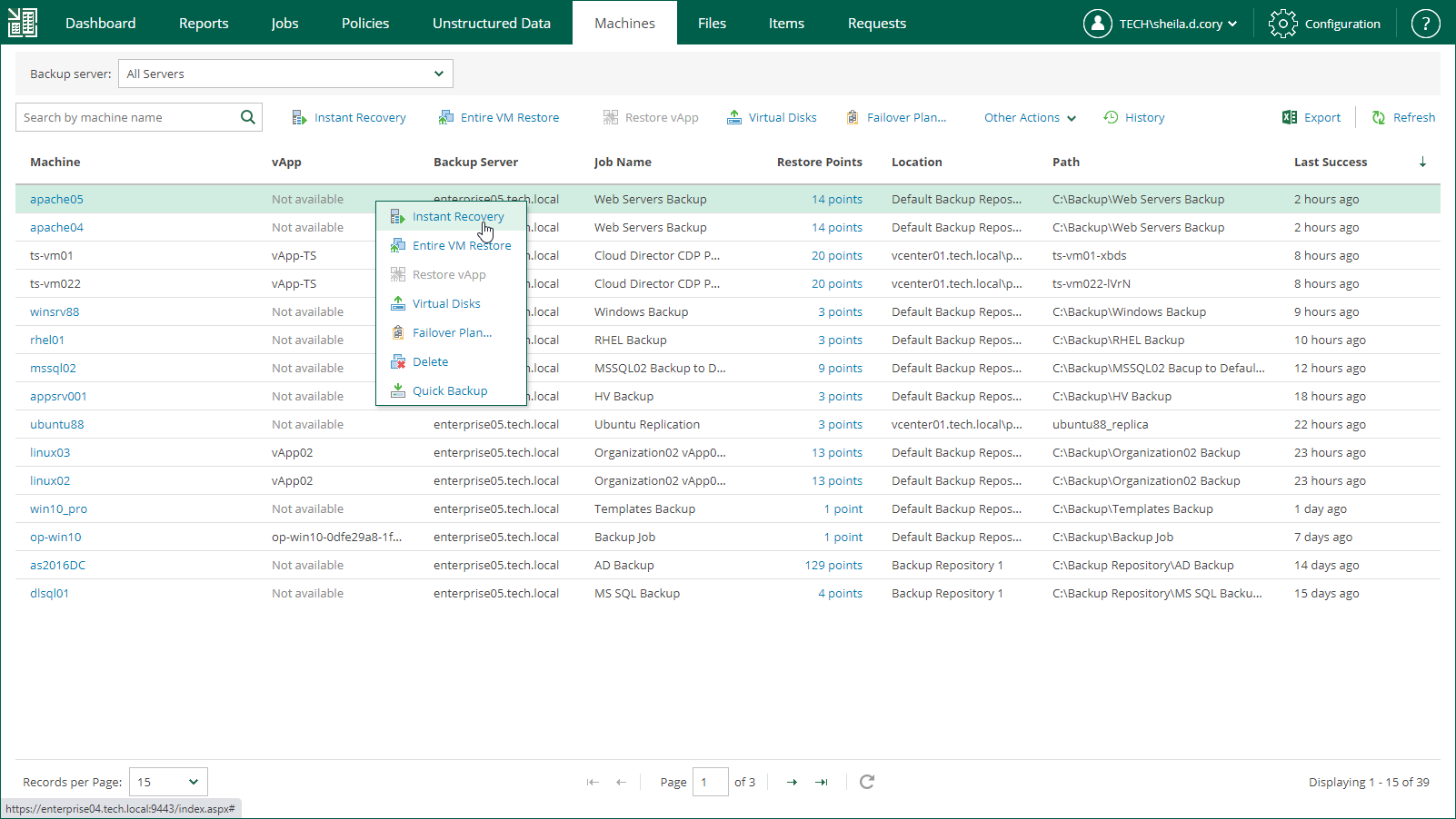 This is an archive version of the document. To get the most up-to-date information, see the current version. Step 1. Launch Instant Recovery Wizard To launch the Instant Recovery to VMware vSphere wizard, do the following:On the Machines tab, select the necessary VMware vSphere VM from the list.On the toolbar, click Instant Recovery.Alternatively, you can right-click the VM and select Instant Recovery.