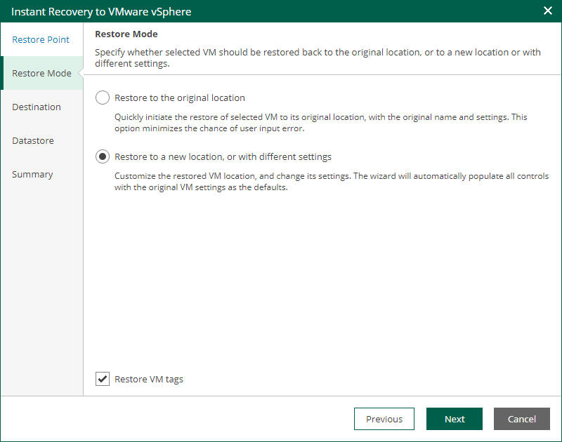 - Select Restore to a new location or with different settings to recover the VM to a new location, or to any location but with different settings. If this option is selected, the Instant Recovery wizard will include additional steps for customizing VM settings.