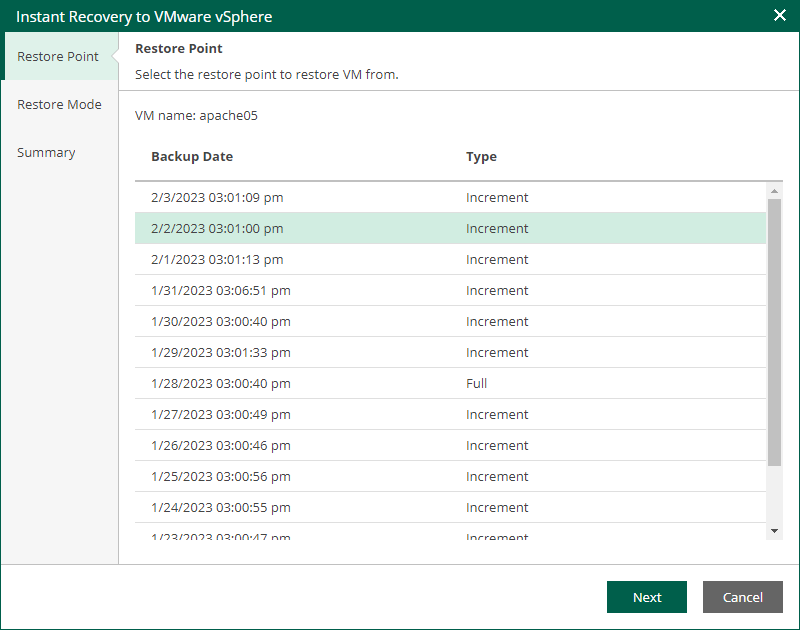This is an archive version of the document. To get the most up-to-date information, see the current version. Step 2. Select Restore Point At the Restore Points step of the wizard, select a VM restore point from which you want to perform instant recovery.