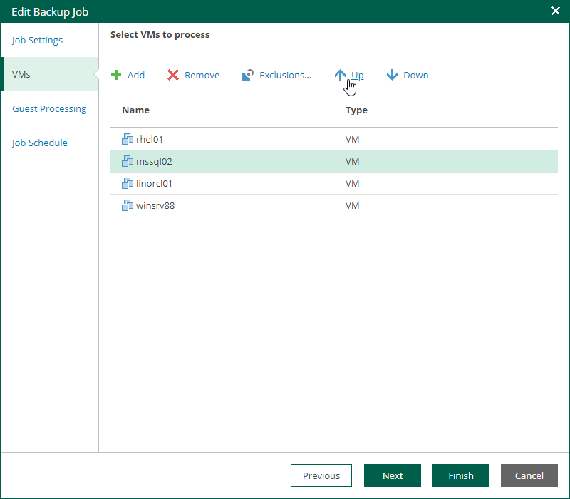 At the Virtual Machines step of the wizard, you can change the VM processing order. It can be helpful if specific VMs must be processed first, if you want to ensure that processing of a MV does not overlap with other scheduled activities, or that VM processing is completed before the certain time.