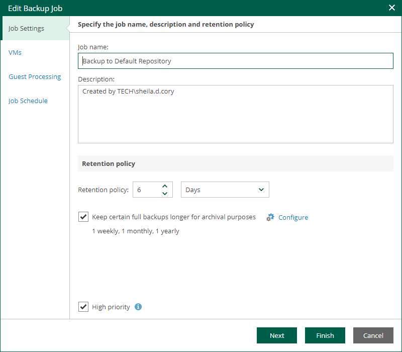 At the Job Settings step of the wizard, you can modify name and description for the selected job, as well as its retention policy.