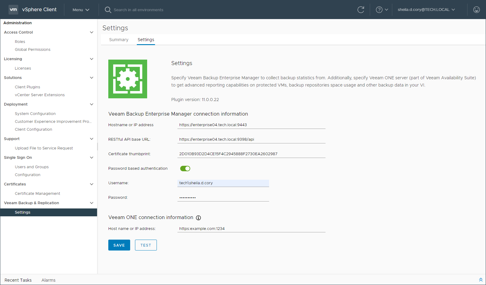 - On the Settings tab, check the plug-in version and specify the following Veeam Backup Enterprise Manager connection properties: