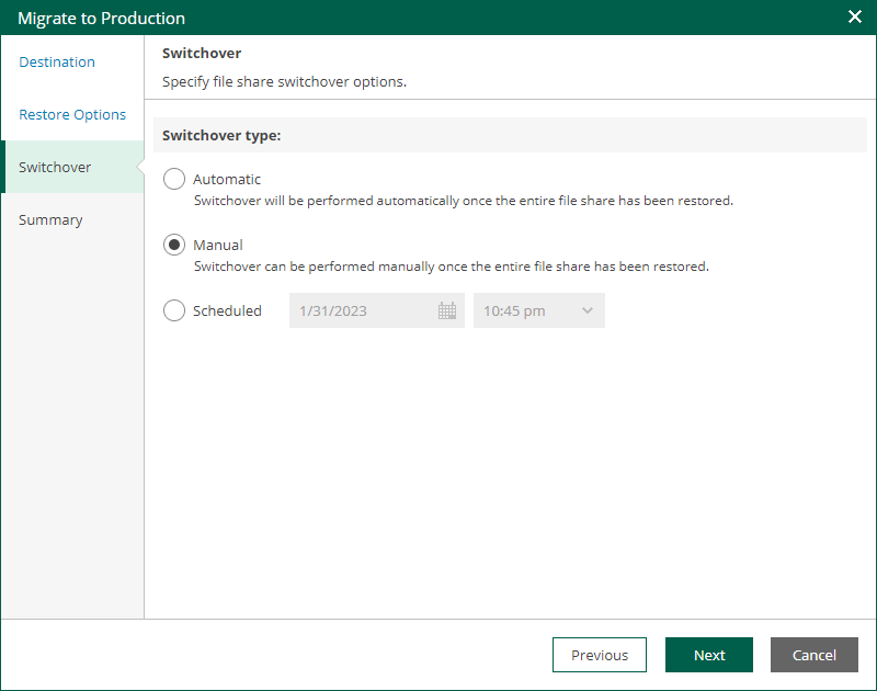 At the Switchover step of the wizard, select a type of the switchover from the mounted file share to the migrated file share.