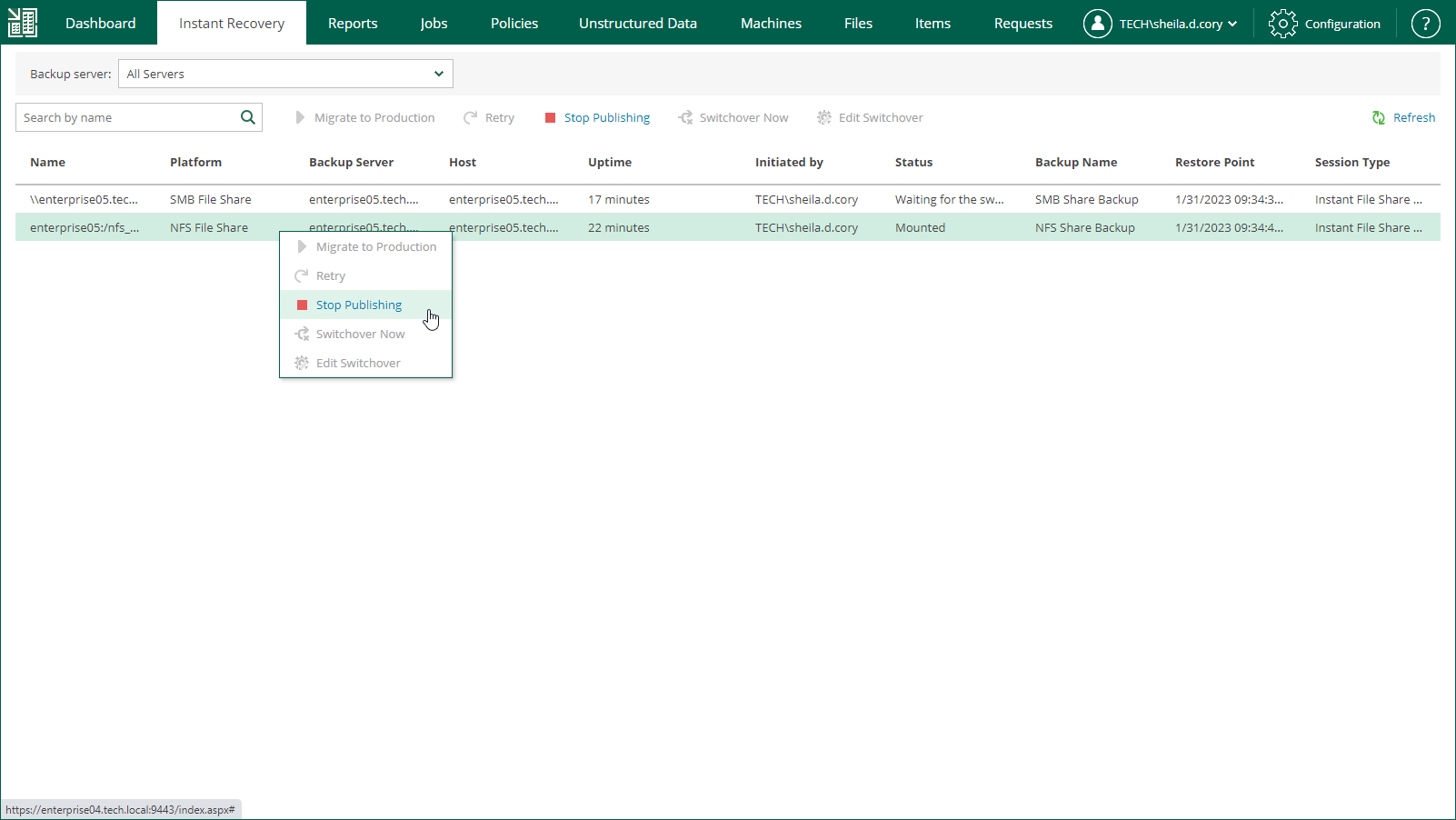 When you finish reviewing the recovered file shares, you can stop publishing them. This will unmount the recovered file shares from the mount server. Note that all changes made in the recovered file shares will be lost.