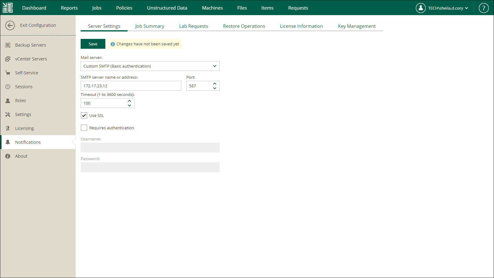 - If the SMTP server requires authentication, select the Requires authentication check box and specify authentication credentials.
