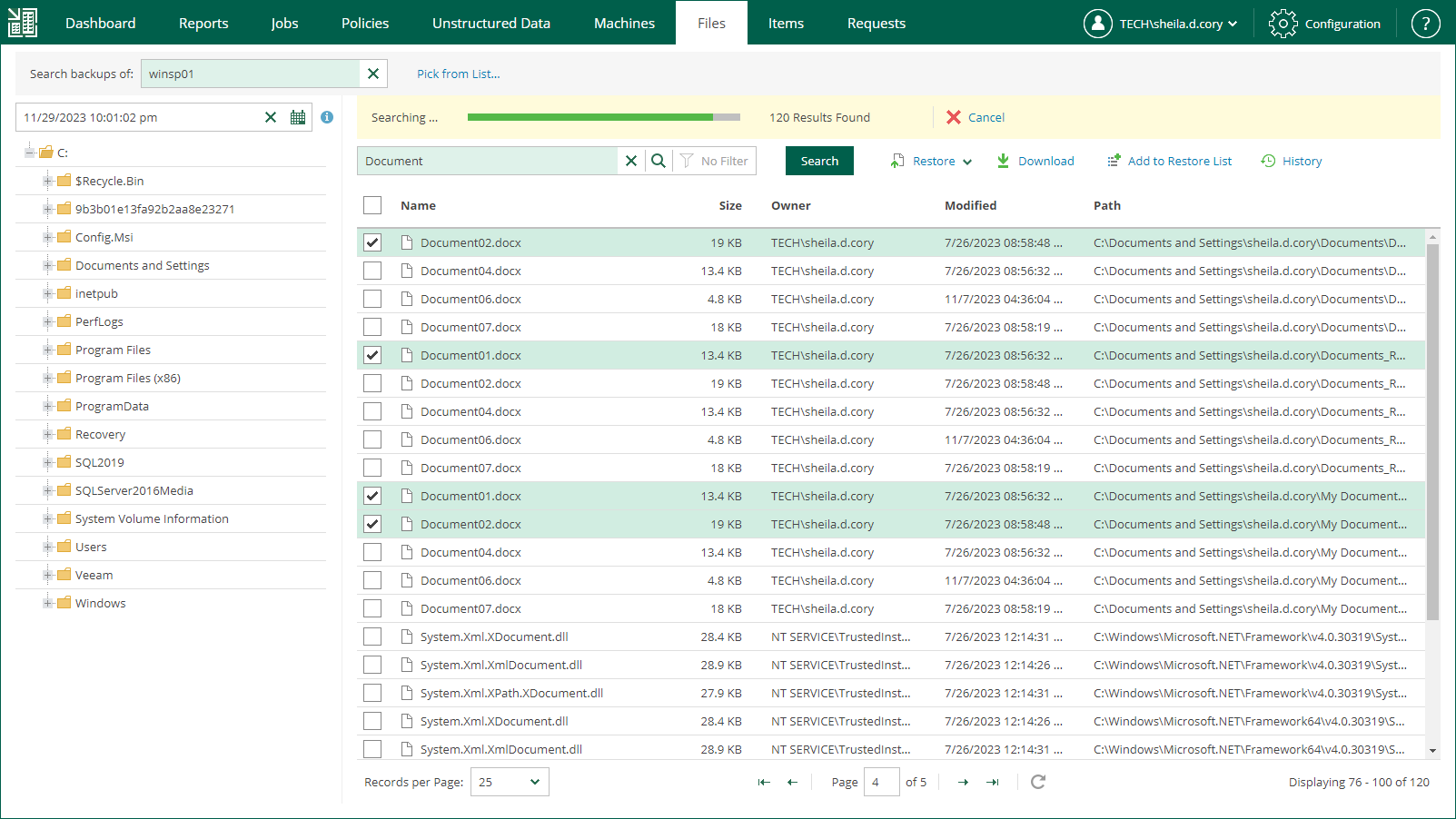 With simple search, you can search for files in a selected restore point of a selected machine backup. After you find necessary files, you can select them to perform file restore.