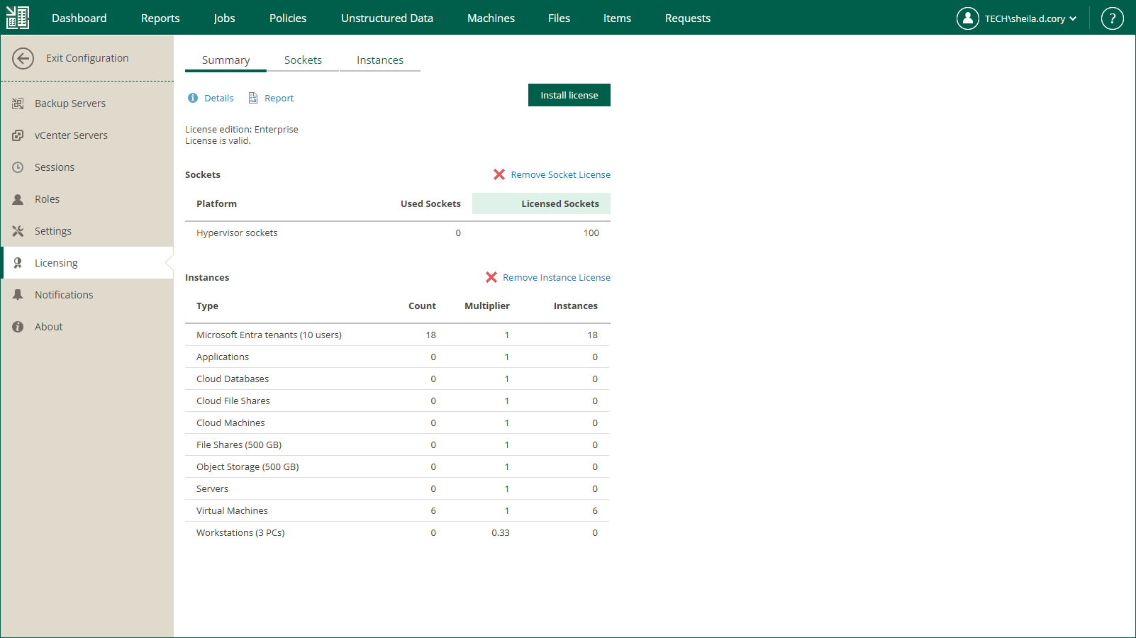 If you have a merged license installed, you can remove a part of it: a socket license or an instance license. After you remove a part of the merged license, Veeam Backup Enterprise Manager and connected backup servers will operate under the other part of the merged license.
