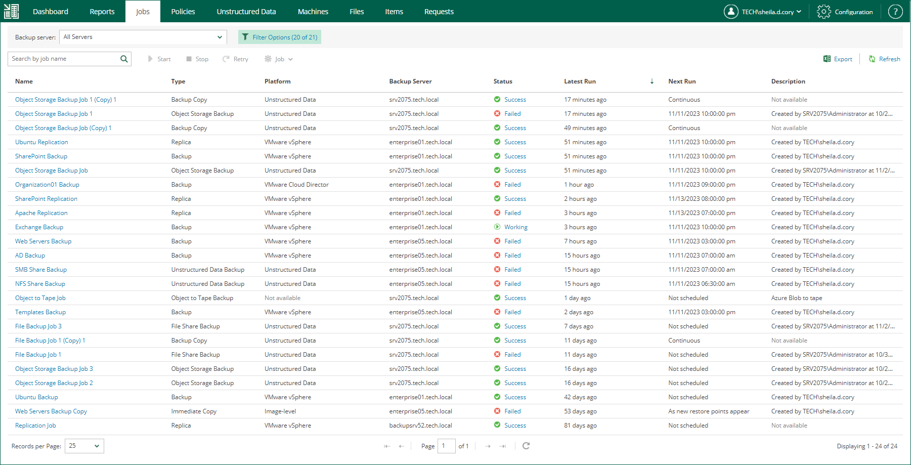 - To view jobs of a specific backup server, select the server from the Backup server drop-down list.