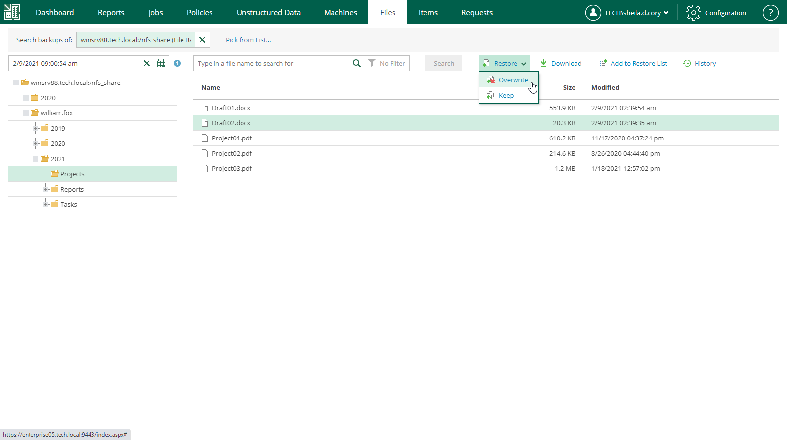 - Locate the necessary file using browse or search possibilities of Veeam Backup Enterprise Manager. For details, see Viewing Unstructured Data Backups and Browsing for Items in Unstructured Data Backups.