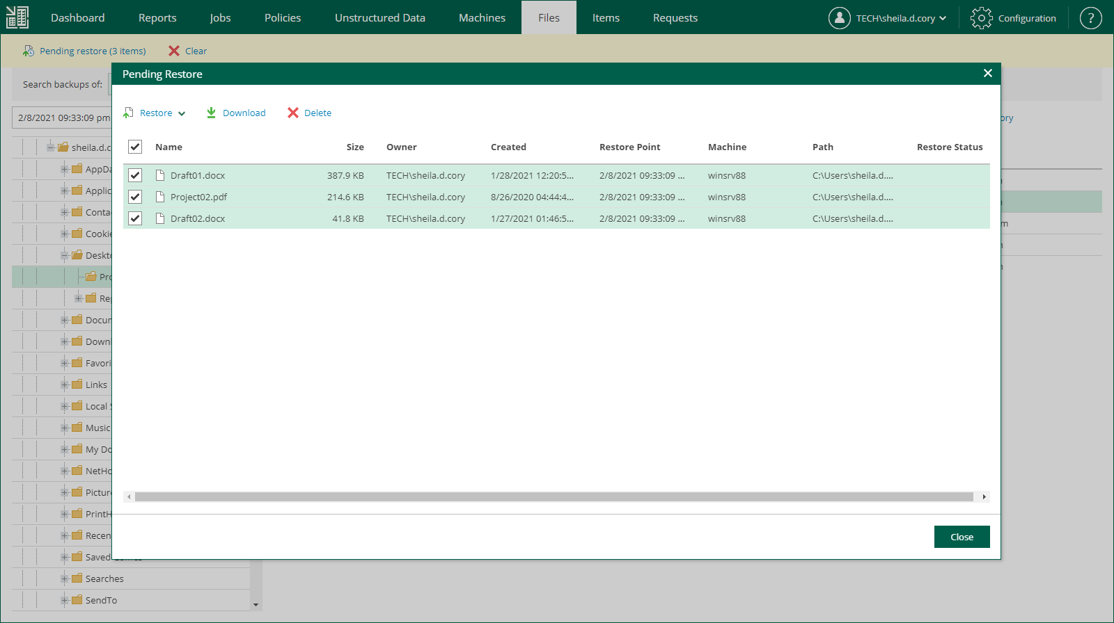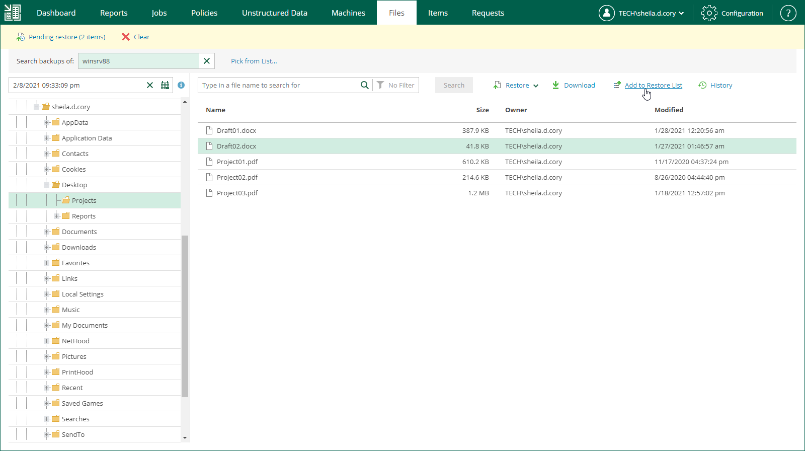 If you want to restore multiple file system objects (files or folders), you can add the necessary files to the restore list and then restore all files at once. Using the restore list helps you prepare for file restore from different machines and restore points.