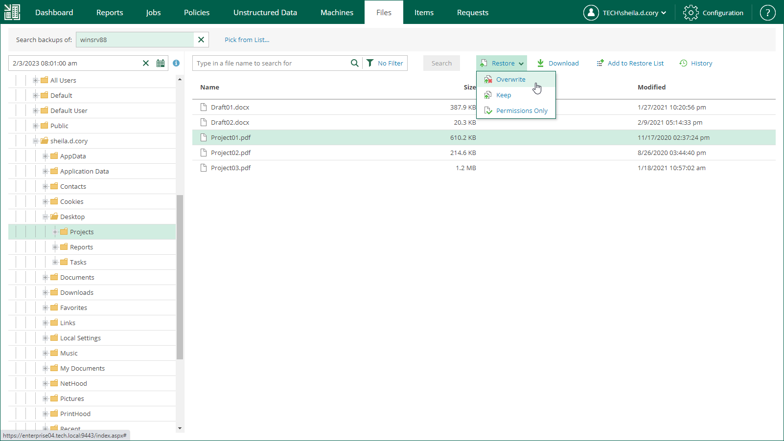 - If you select Keep, the object from the backup will be restored next to the original object on the target machine. The restored object will have the _RESTORED_<DATE>_<TIME> prefix in its name, where <DATE>_<TIME> is the restore date and time.