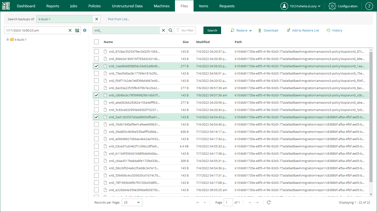Veeam Backup Enterprise Manager allows you to search unstructured data (file shares and object storage systems) for specific items. After you find necessary files, you can select them to perform file restore.