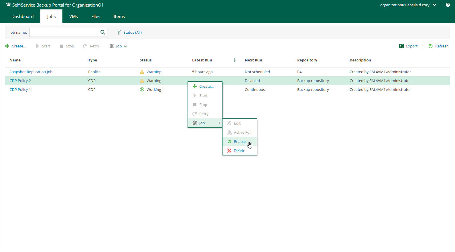 Members of a VMware Cloud Director organization can enable and disable organization backup jobs, replication jobs and CDP policies. Disabled jobs and policies are temporary paused.