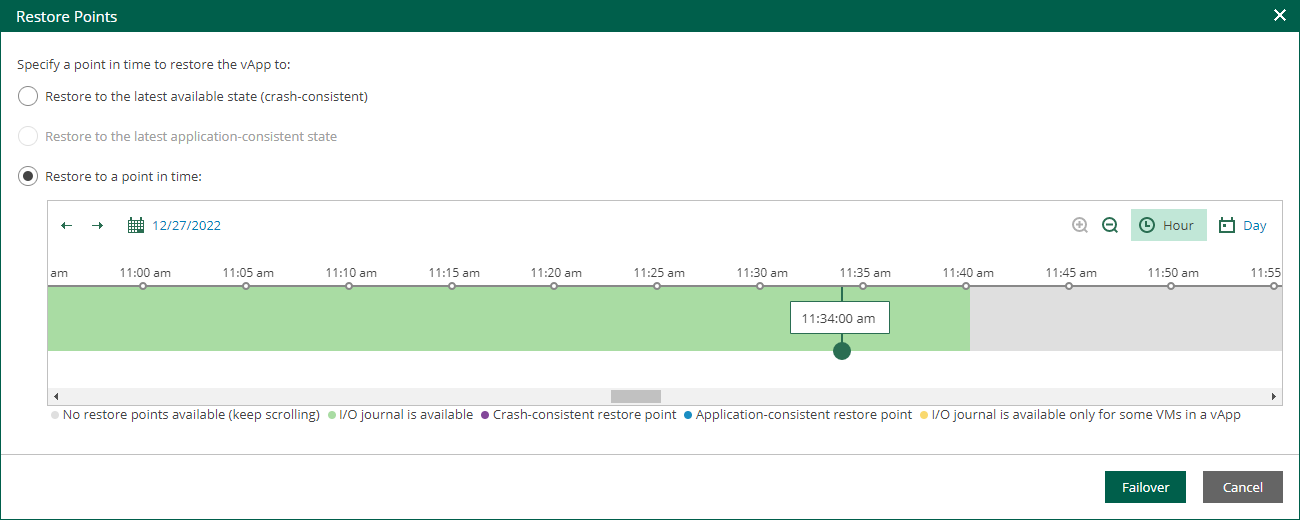 - In the Restore Points window, select the restore point you need. You can fail over to the latest available crash-consistent state, to the latest application-consistent state, or to a specific point in time.