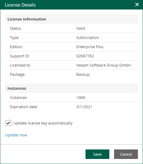 You can display detailed information about the current license, including license type, expiration date and the number of instances. To do this, click the Details link. To view information about license usage, click the Report link.