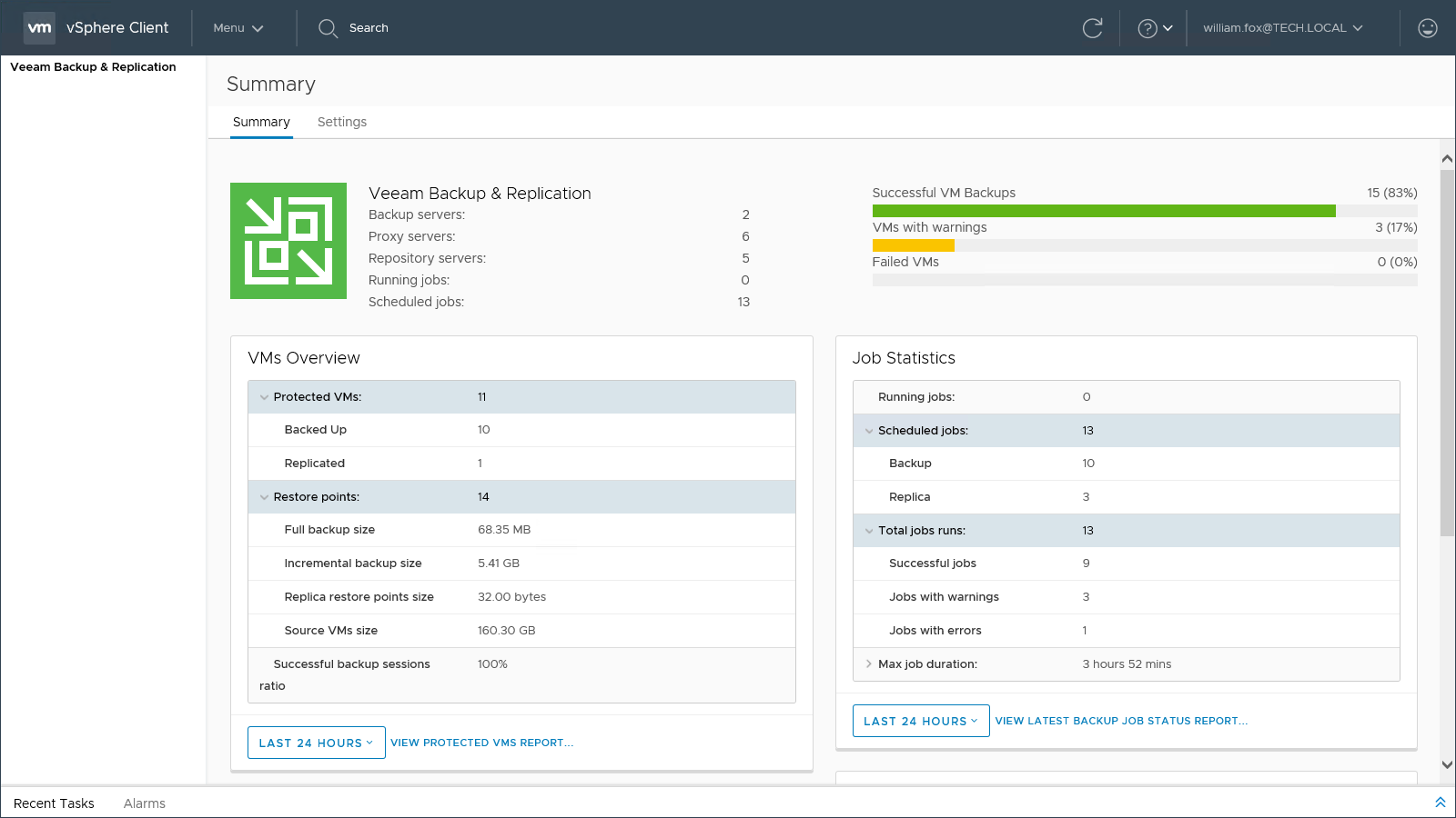 In particular, vSphere administrators can view success, warning and failure counts for all jobs, as well as cumulative information on used and available storage space, and statistics on processed VMs. They can easily identify unprotected VMs and perform capacity planning, as well as create restore points for selected VMs using VeeamZIP and Quick Backup functions, all directly from vSphere Client.