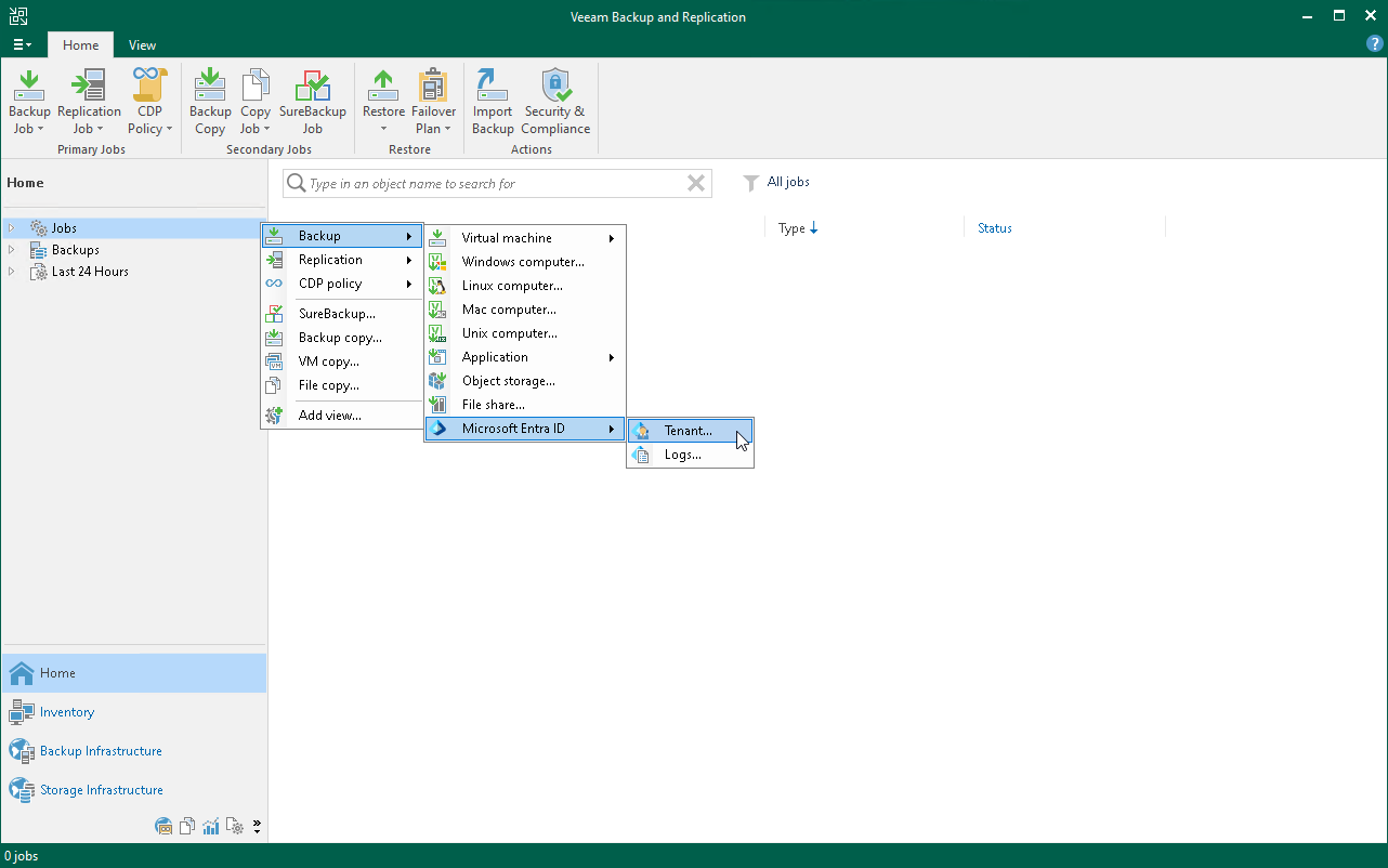 This is an archive version of the document. To get the most up-to-date information, see the current version. Step 1. Launch New Microsoft Entra ID Tenant Backup Job Wizard To create a Microsoft Entra ID tenant backup job, do one of the following:Open the Home view. On the ribbon, click Backup Job > Microsoft Entra ID > Tenant.Open the Home view. In the inventory pane, right-click Jobs and select Backup > Microsoft Entra ID > Tenant.