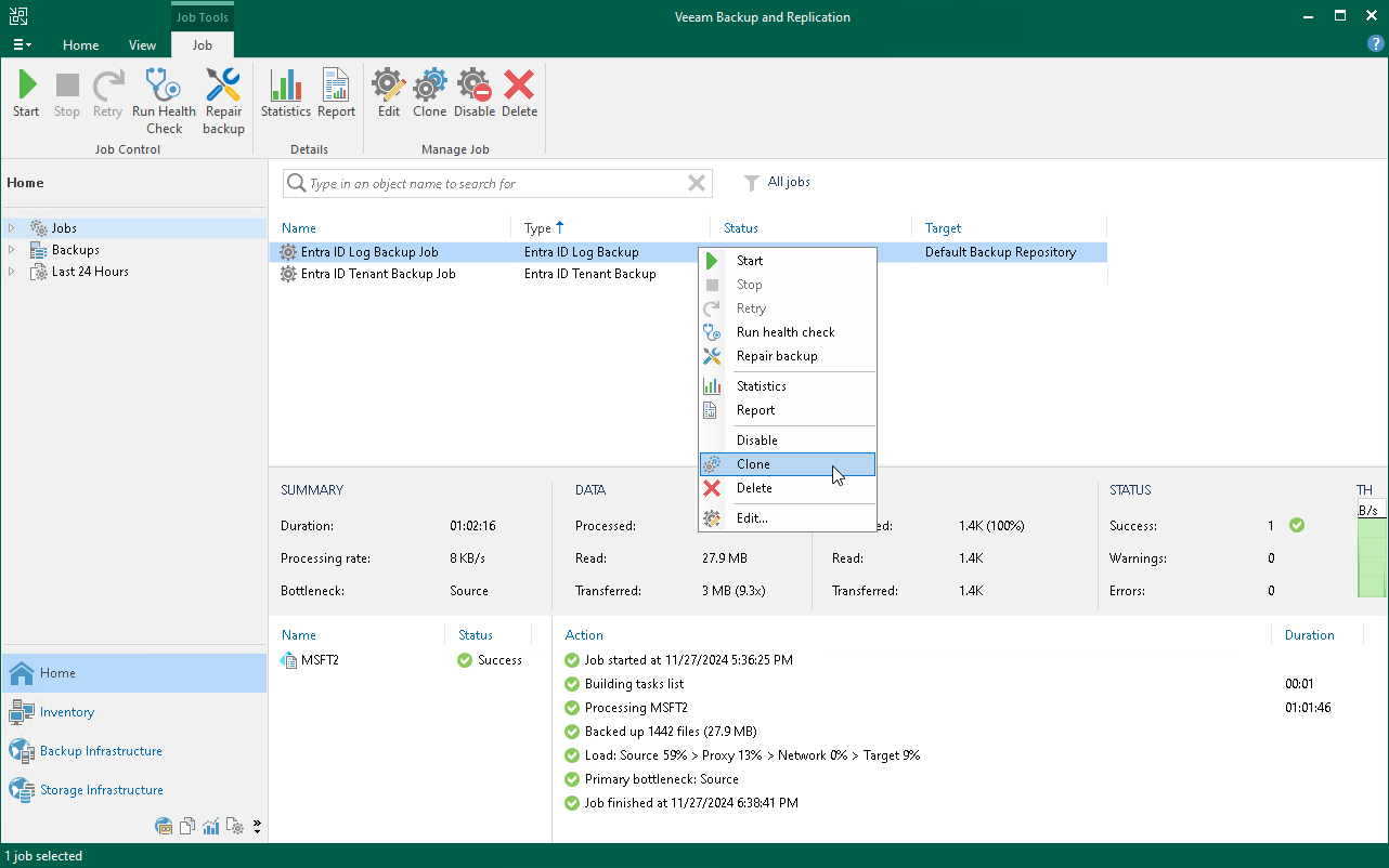 - In the working area, select the job and click Clone on the ribbon. Alternatively, right-click the job and select Clone.