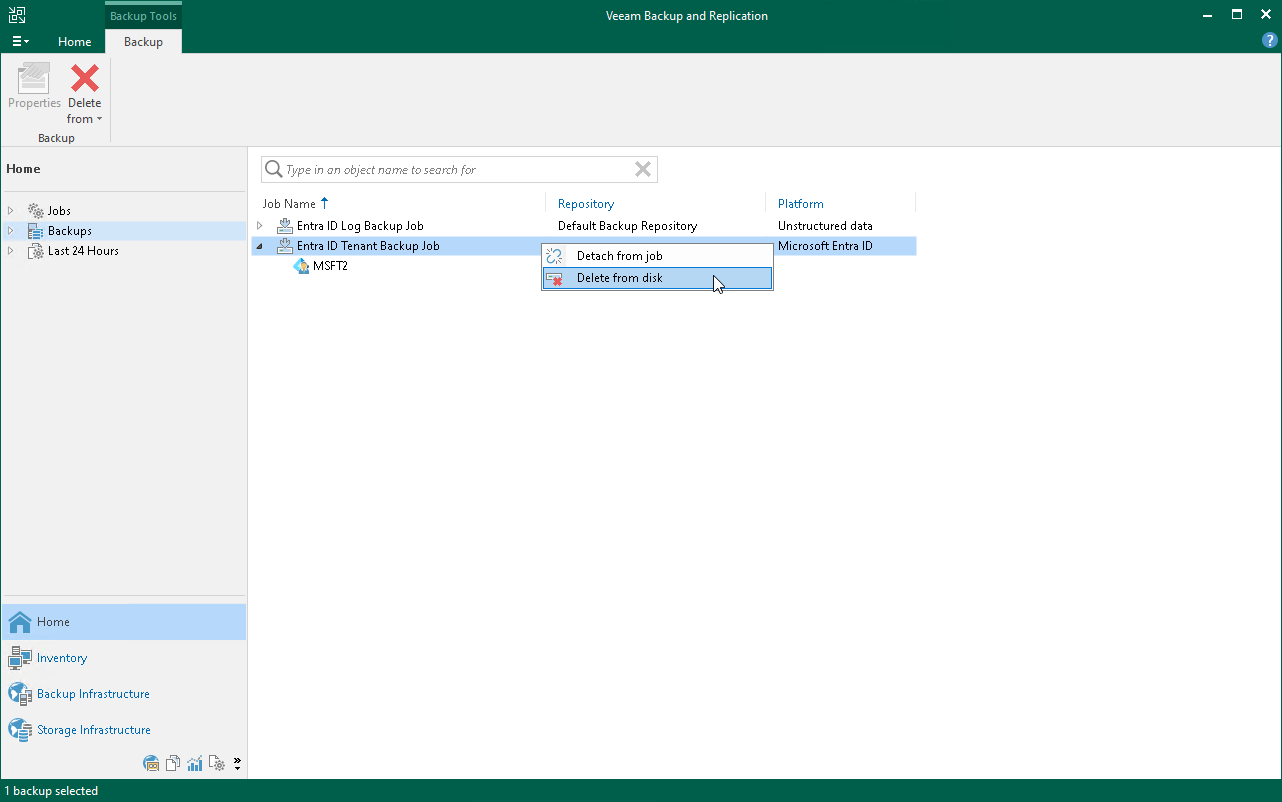 In the working area, select the backup and click Delete from > Disk on the ribbon. Alternatively, you can right-click the backup and select Delete from disk.