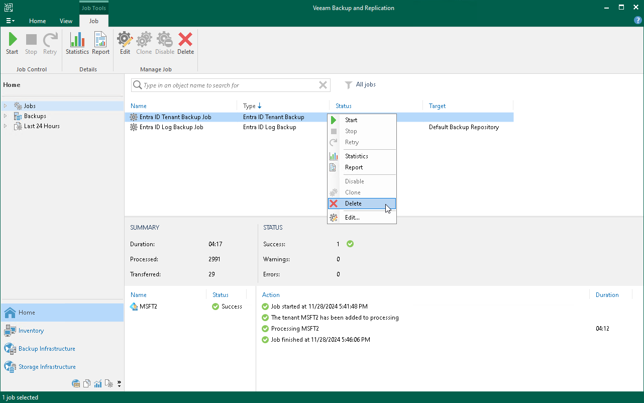 - In the working area, select the job and click Delete on the ribbon or right-click the job and select Delete.