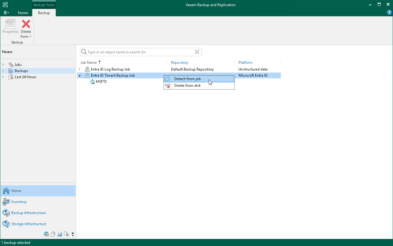 - In the working area, right-click the necessary backup and select Detach from job. Alternatively, click Delete from > Job on the ribbon.