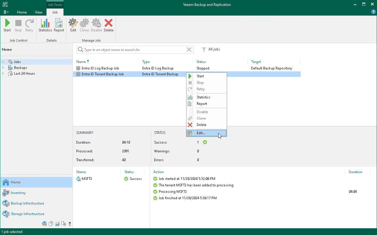 This is an archive version of the document. To get the most up-to-date information, see the current version. Editing Backup Job Settings To edit job settings:Open the Home view.In the inventory pane, select Jobs > Backup.In the working area, select the job and click Edit on the ribbon or right-click the job and select Edit.You will follow the same steps you followed when creating the job and can change job settings as required.