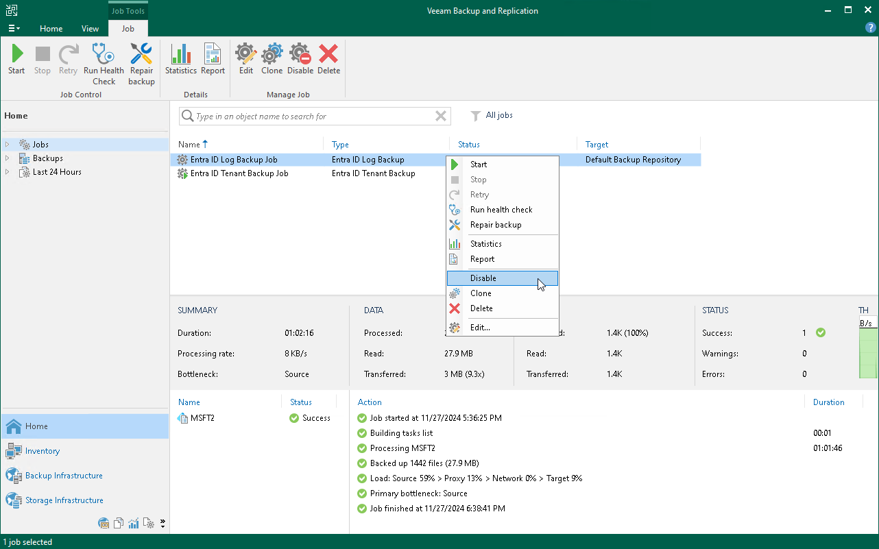 - In the working area, select the job and select Disable on the ribbon or right-click the job and select Disable.