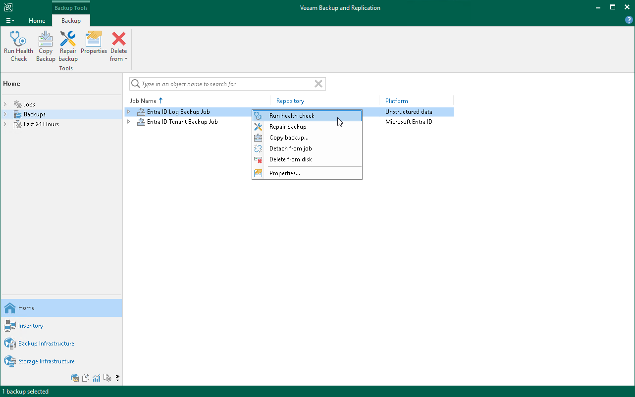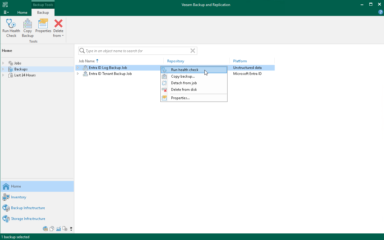 - In the working area, select the required log backup and click Run Health Check on the ribbon. Alternatively, you can right-click the backup and select Run health check.