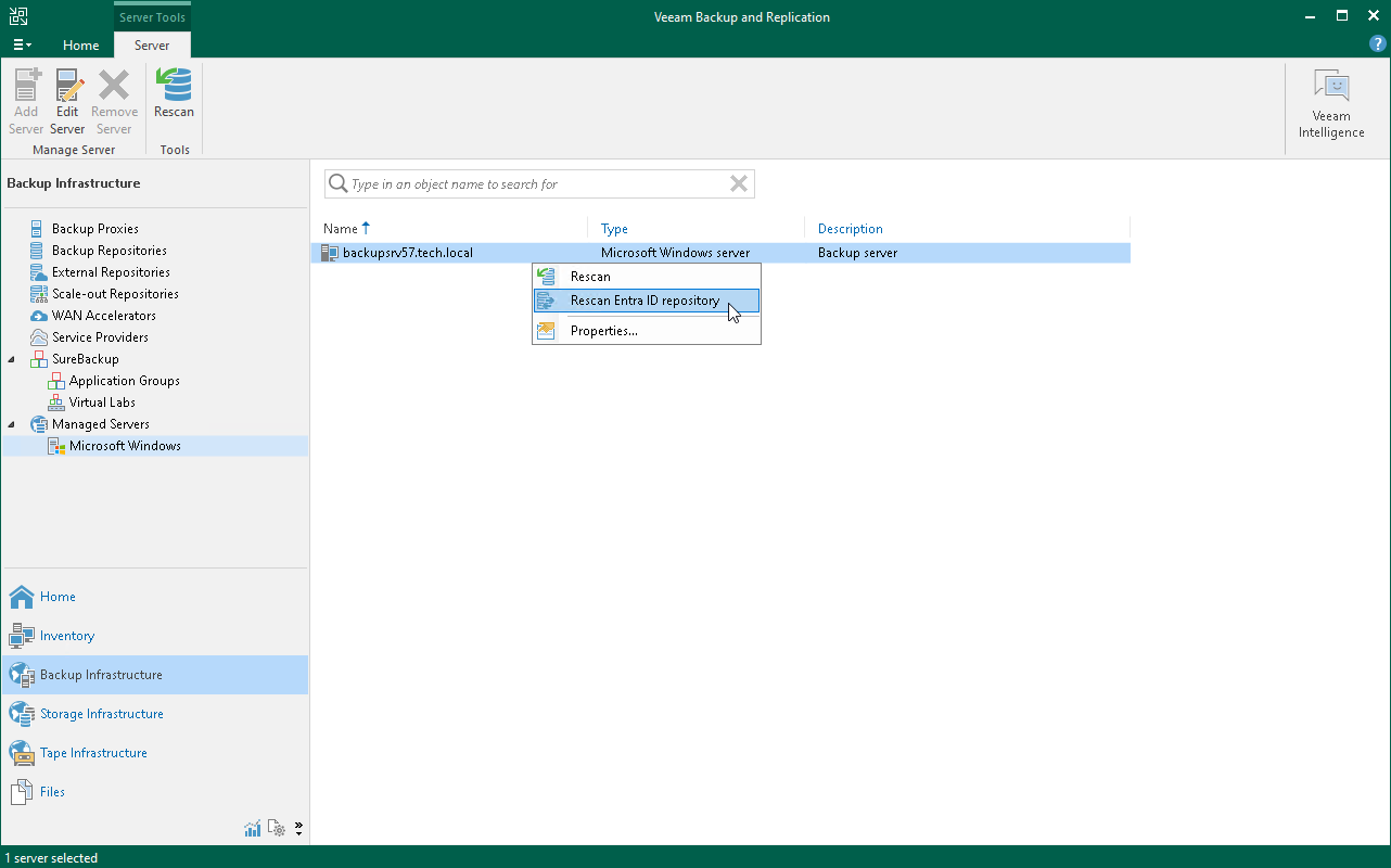 - Press the [Ctrl] key, right-click the backup server and select Rescan Entra ID repository.