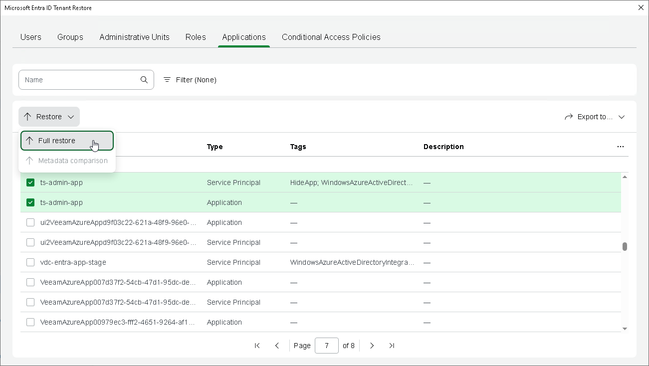 - To launch the application restore wizard, click Restore > Full Restore. Alternatively, right-click one of the selected applications or service principals and select Restore > Full restore.