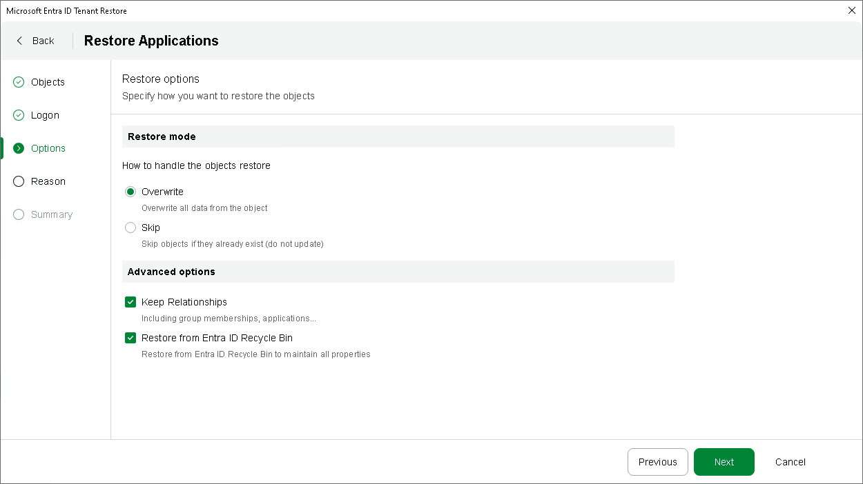 At the Options step of the wizard, configure the restore options, such as how to restore applications and service principals, their relationships and other: