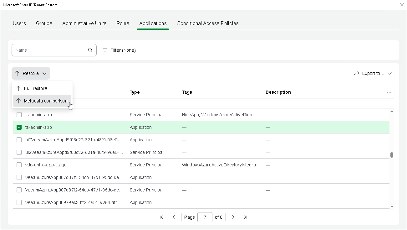 - Click Restore > Metadata comparison. Alternatively, right-click the selected application or service principle and select Restore > Metadata comparison.