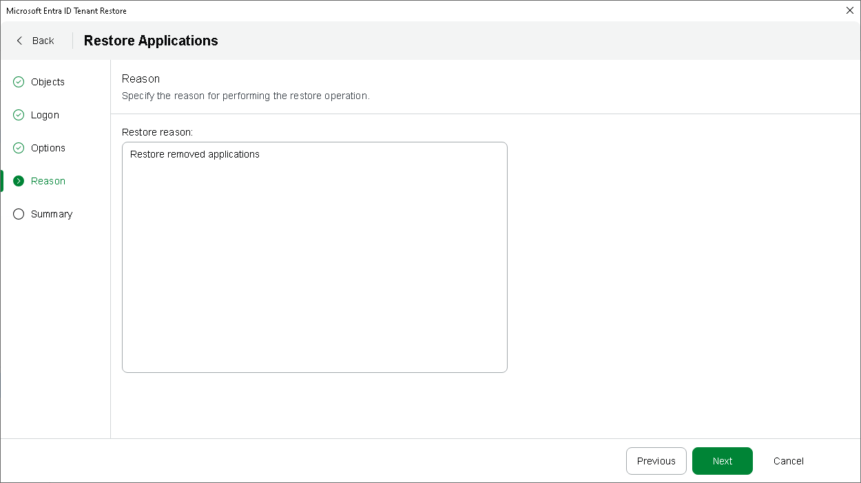 At the Reason step of the wizard, enter a reason for restoring applications and service principals. This information will be saved to the session history, and you will be able to reference it later.