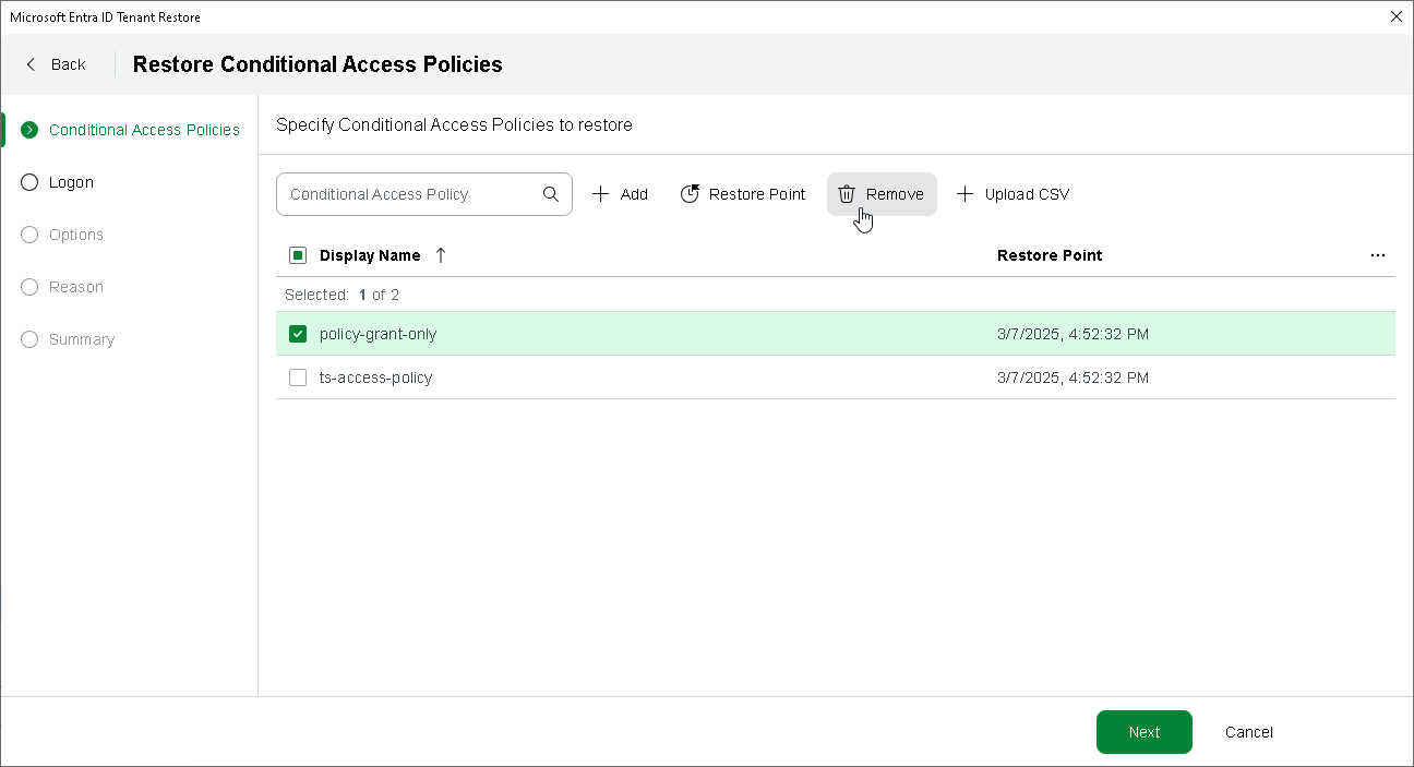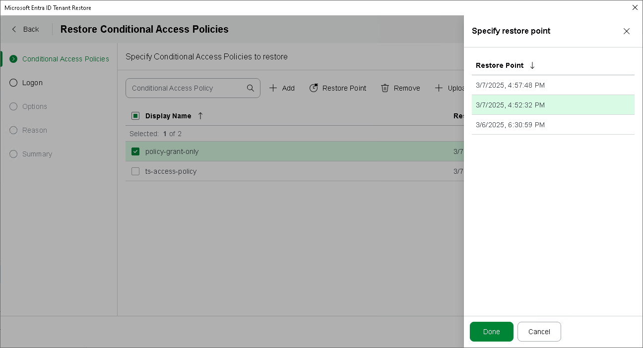 At the Conditional Access Policies step of the wizard, select restore points. By default, Veeam Backup & Replication uses the most recent valid restore point for each Conditional Access policy. However, you can restore a policy to an earlier state.