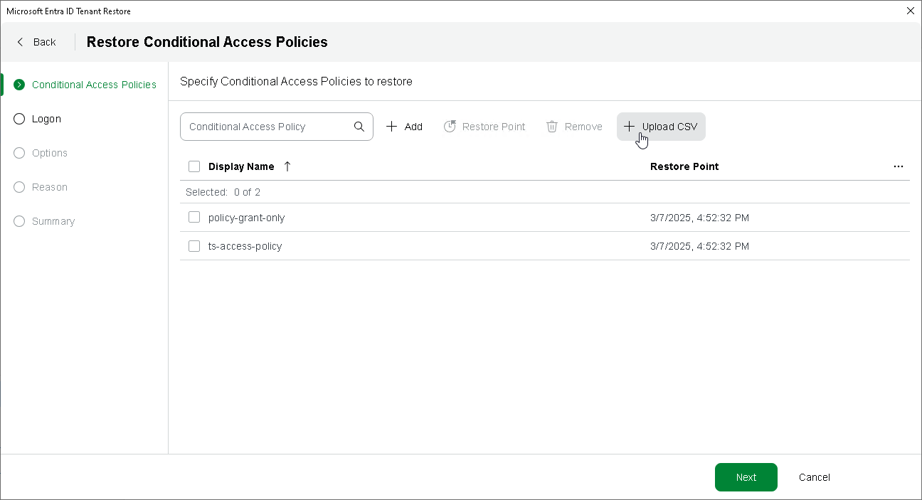 If you have a list of the Conditional Access policies to be restored, you can import it. To do that, click Upload CSV. The imported list will be added to the list of currently selected policies.