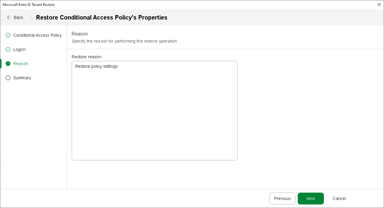 At the Reason step of the wizard, enter a reason for restoring Conditional Access policy properties. This information will be saved to the session history, and you will be able to reference it later.
