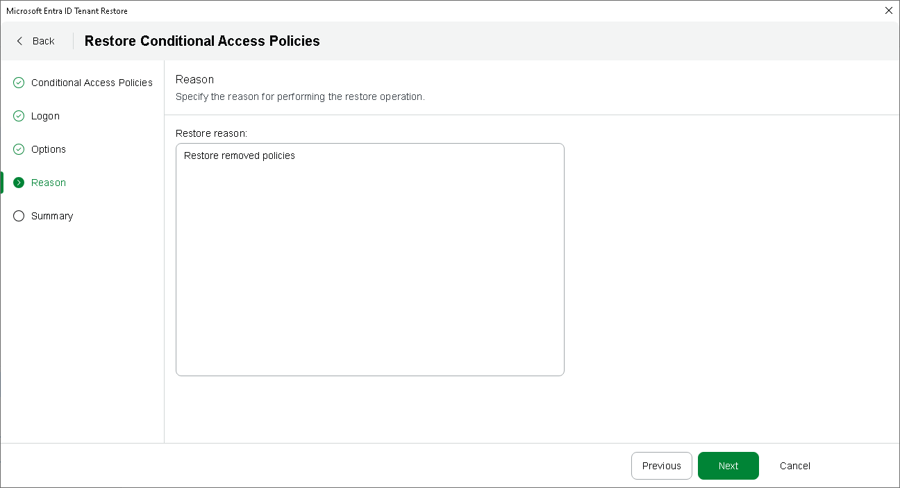 At the Reason step of the wizard, enter a reason for restoring Conditional Access policies. This information will be saved to the session history, and you will be able to reference it later.