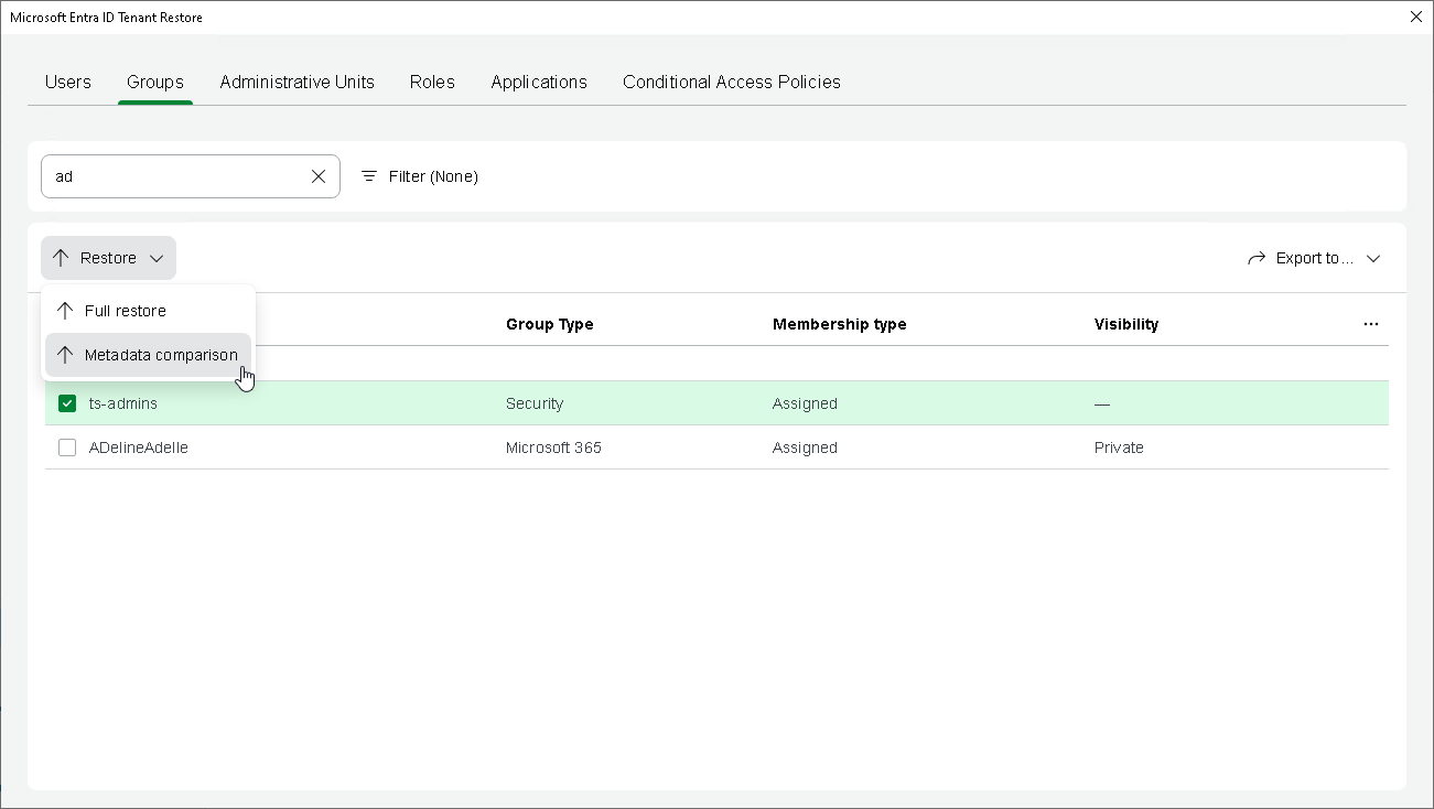 - Click Restore > Metadata comparison. Alternatively, right-click the selected group and select Restore > Metadata comparison.
