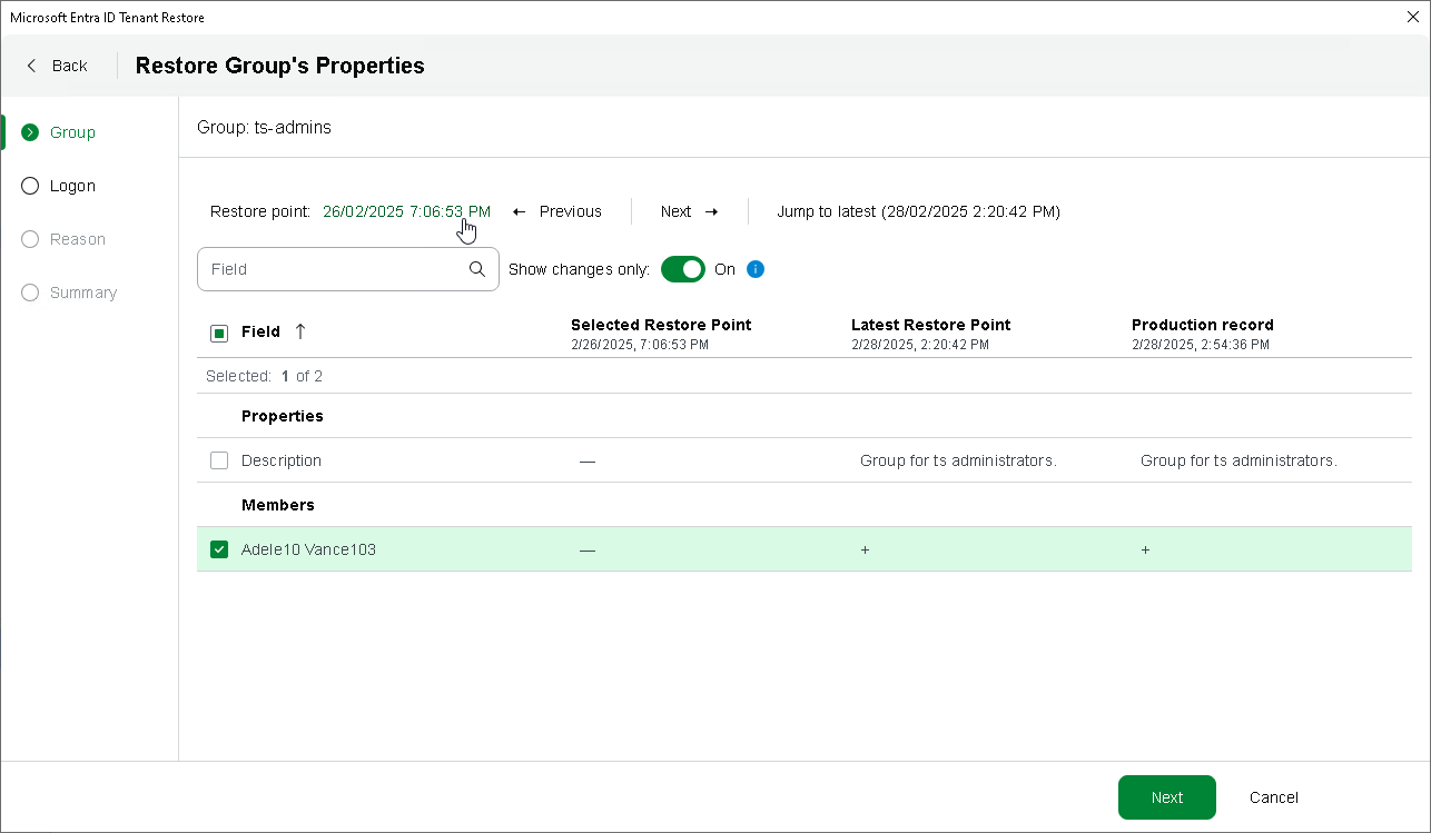 - In the list of properties, select the properties you want to restore. In the Selected Restore Point, Latest Restore Point and Production record columns, you can see values of the properties at different moments of time.