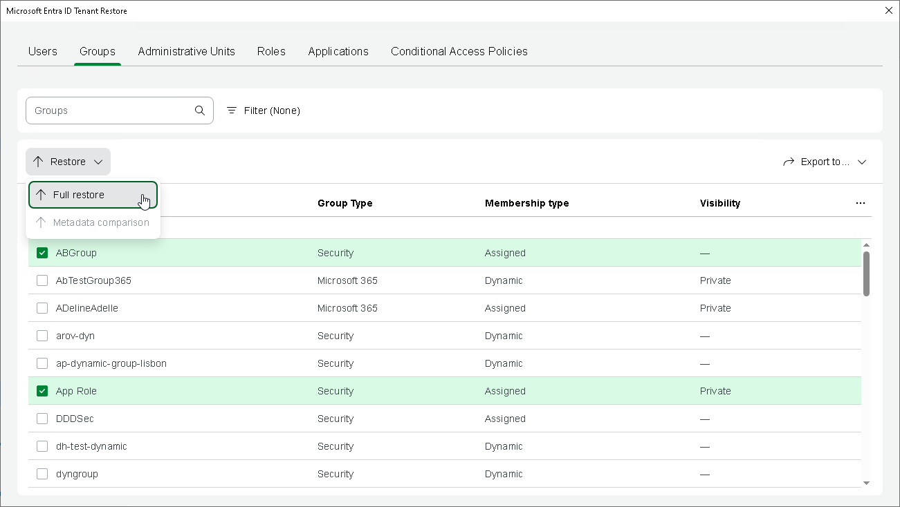 - To launch the group restore wizard, click Restore > Full Restore. Alternatively, right-click one of the selected groups and select Restore > Full restore.