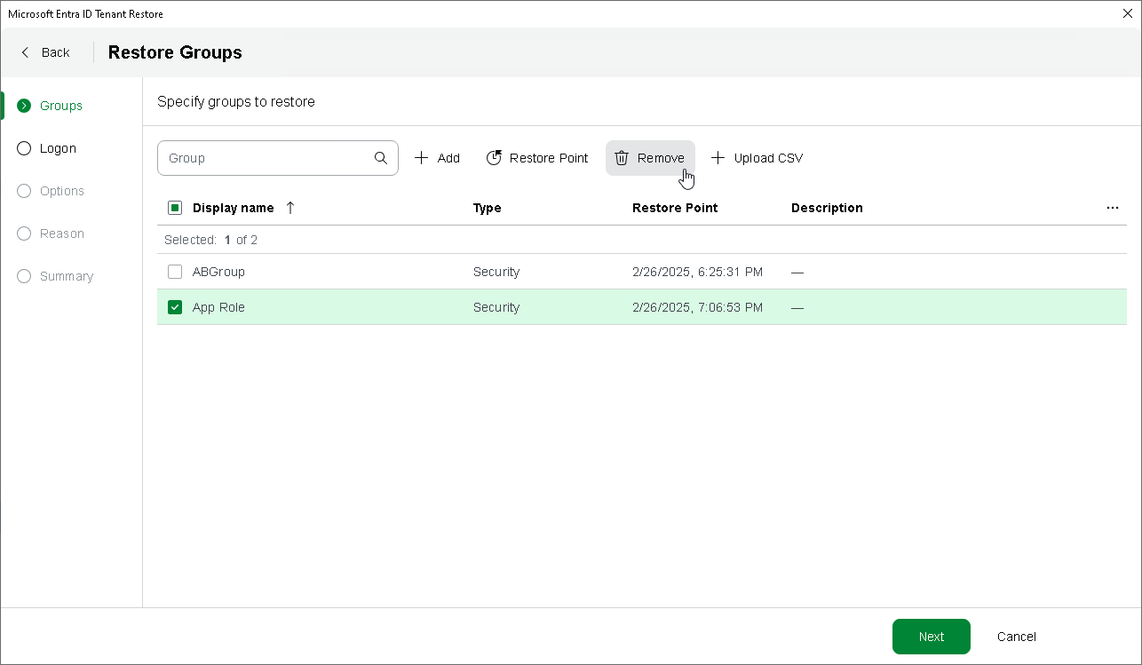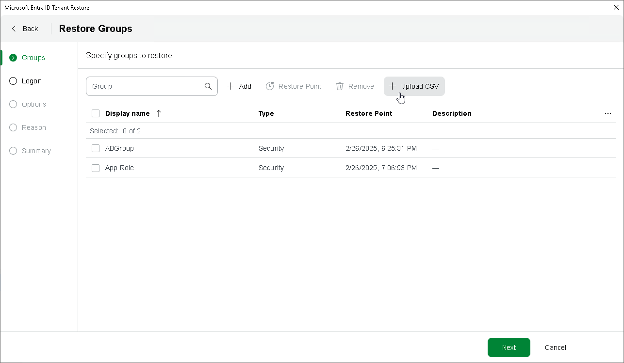 If you have a list of the groups to be restored, you can import it. To do that, click Upload CSV. The imported list will be added to the list of currently selected groups.