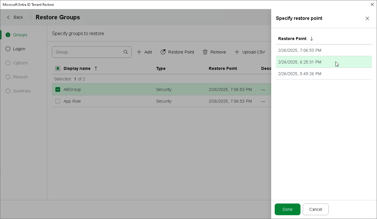 At the Groups step of the wizard, select restore points. By default, Veeam Backup & Replication uses the most recent valid restore point for each group. However, you can restore a group to an earlier state.