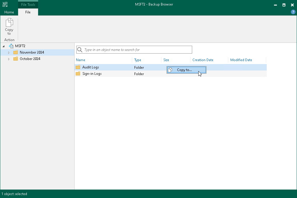 In the Backup Browser window, select files or folders that you want to restore, right-click one of them and select Copy to. Alternatively, you can use Copy to on the ribbon.
