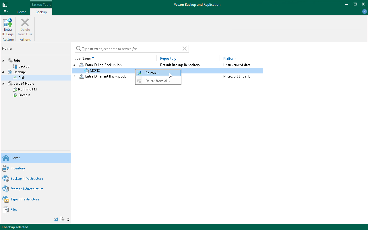 - Select the tenant whose logs are protected and click Entra ID Logs Restore on the ribbon. Alternatively, you can right-click the tenant and select Restore.