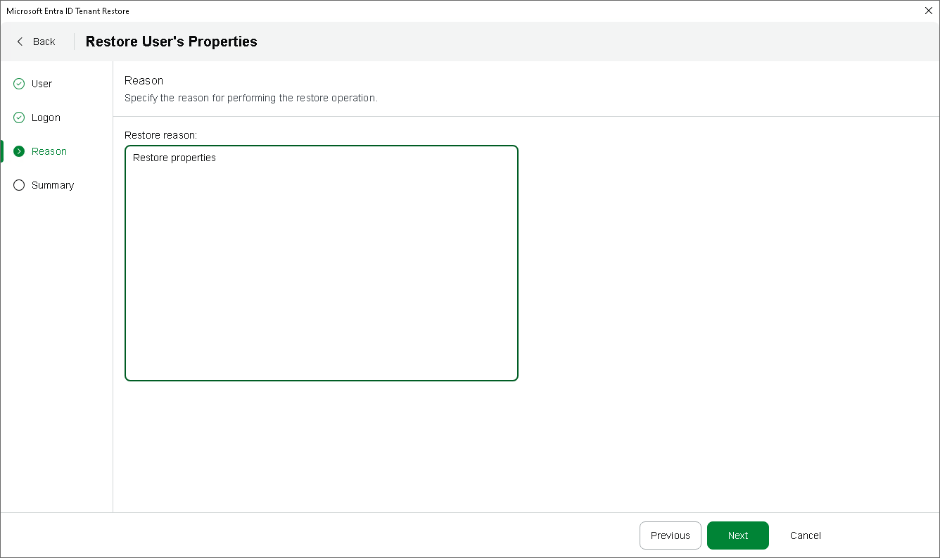 At the Reason step of the wizard, enter a reason for restoring user properties. This information will be saved to the session history, and you will be able to reference it later.